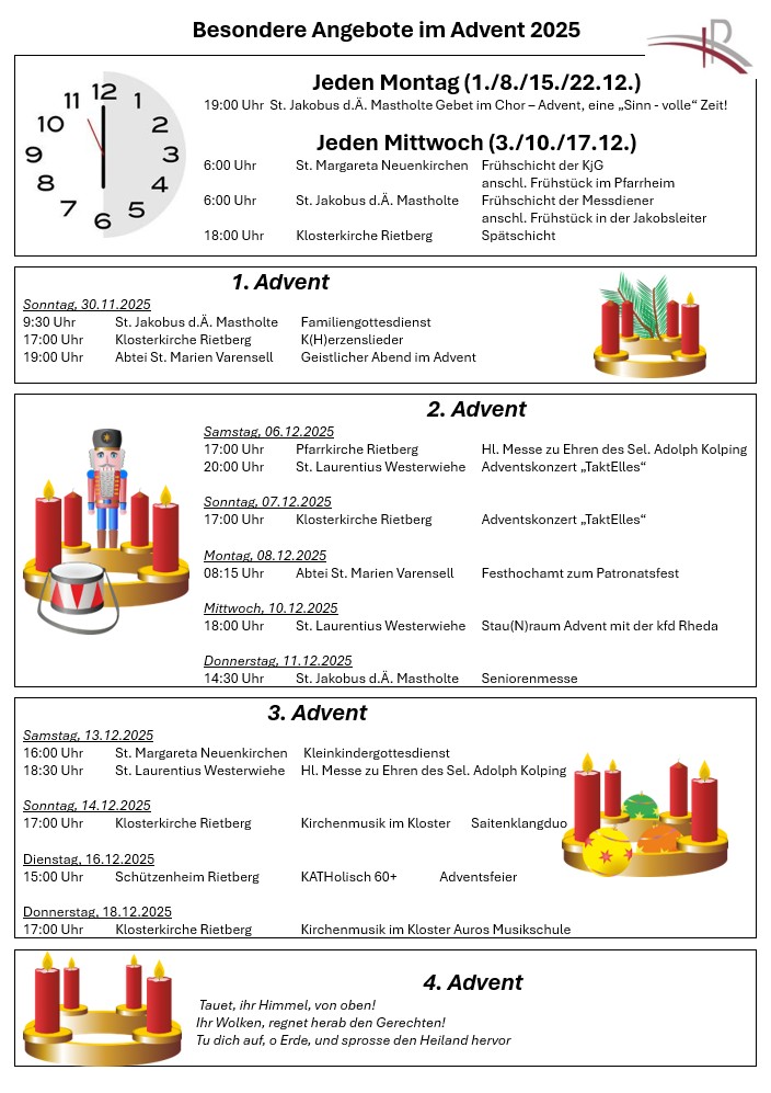 Dazu bieten wir im Pastoralen Raum immer wieder verschiedene Gottesdienste und Konzerte an. Angefangen von den regelmäßigen Früh- und Spätschichten über Angebote für Groß und Klein.