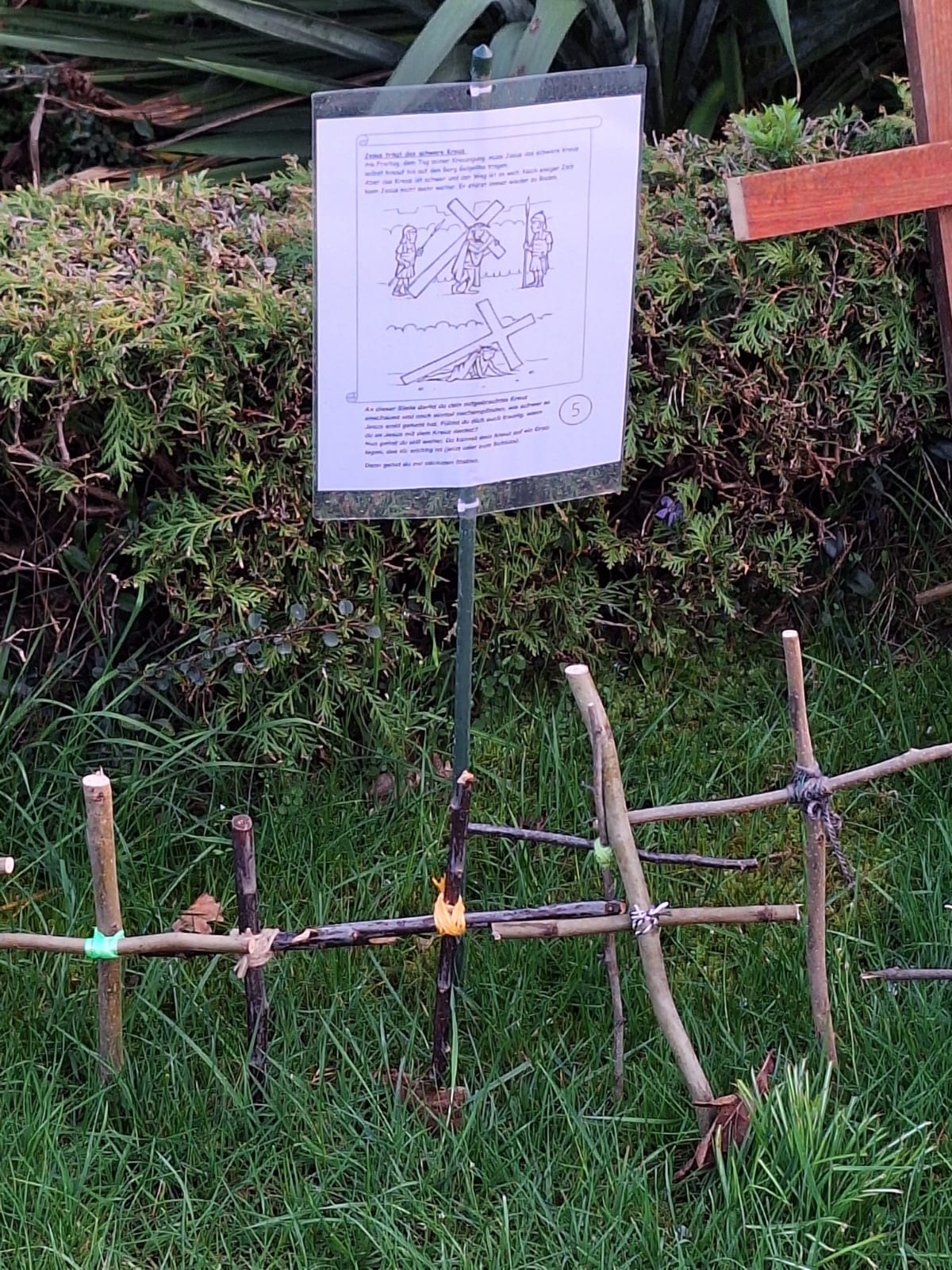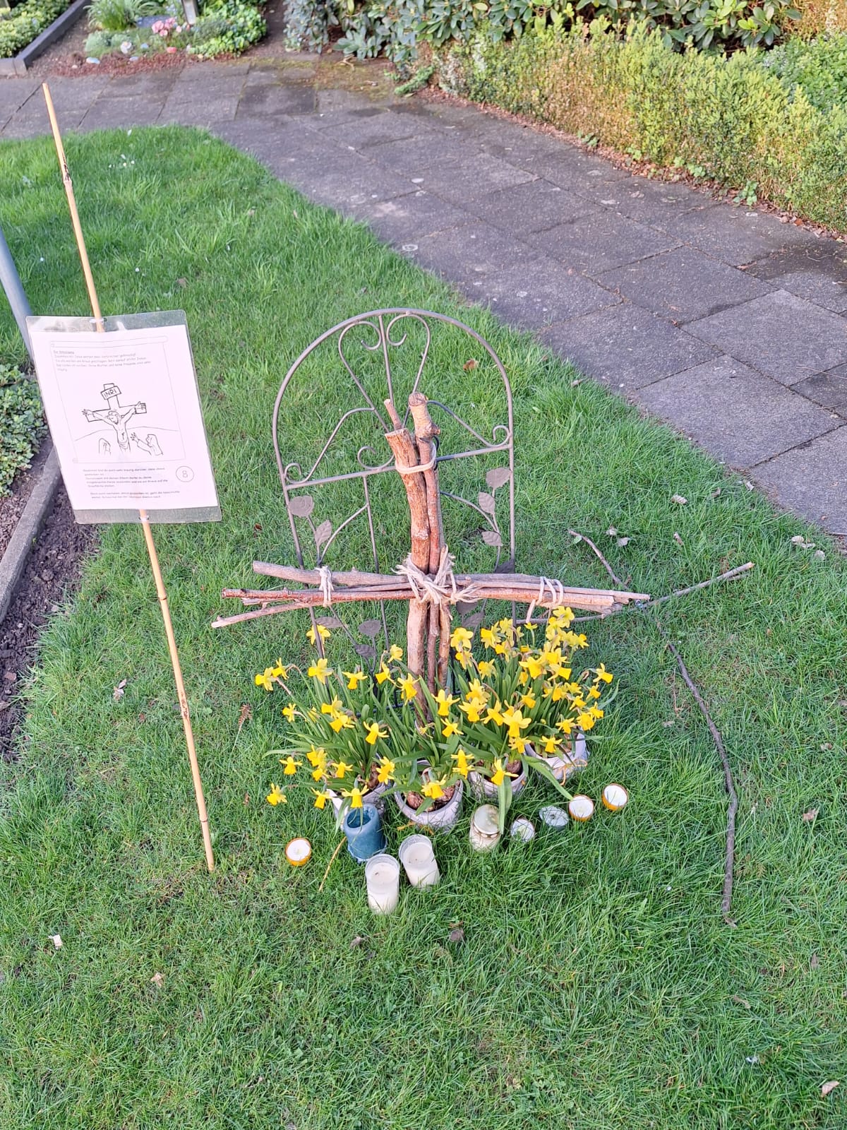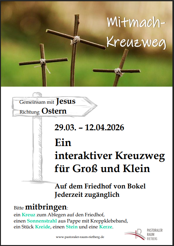 Vom 29.03.-12.04.2026 gibt es auf dem Friedhof Bokel einen interaktiven Kreuzweg für Familien. Bitte mitbringen: ein Kreuz zum Ablegen, einen Sonnenstrahl aus Pappe, ein Stück Kreide, einen Stein und eine Kerze.