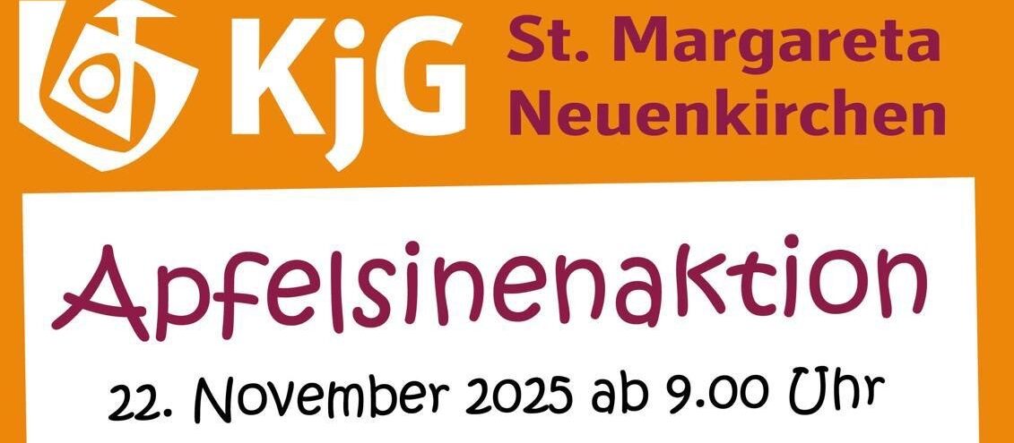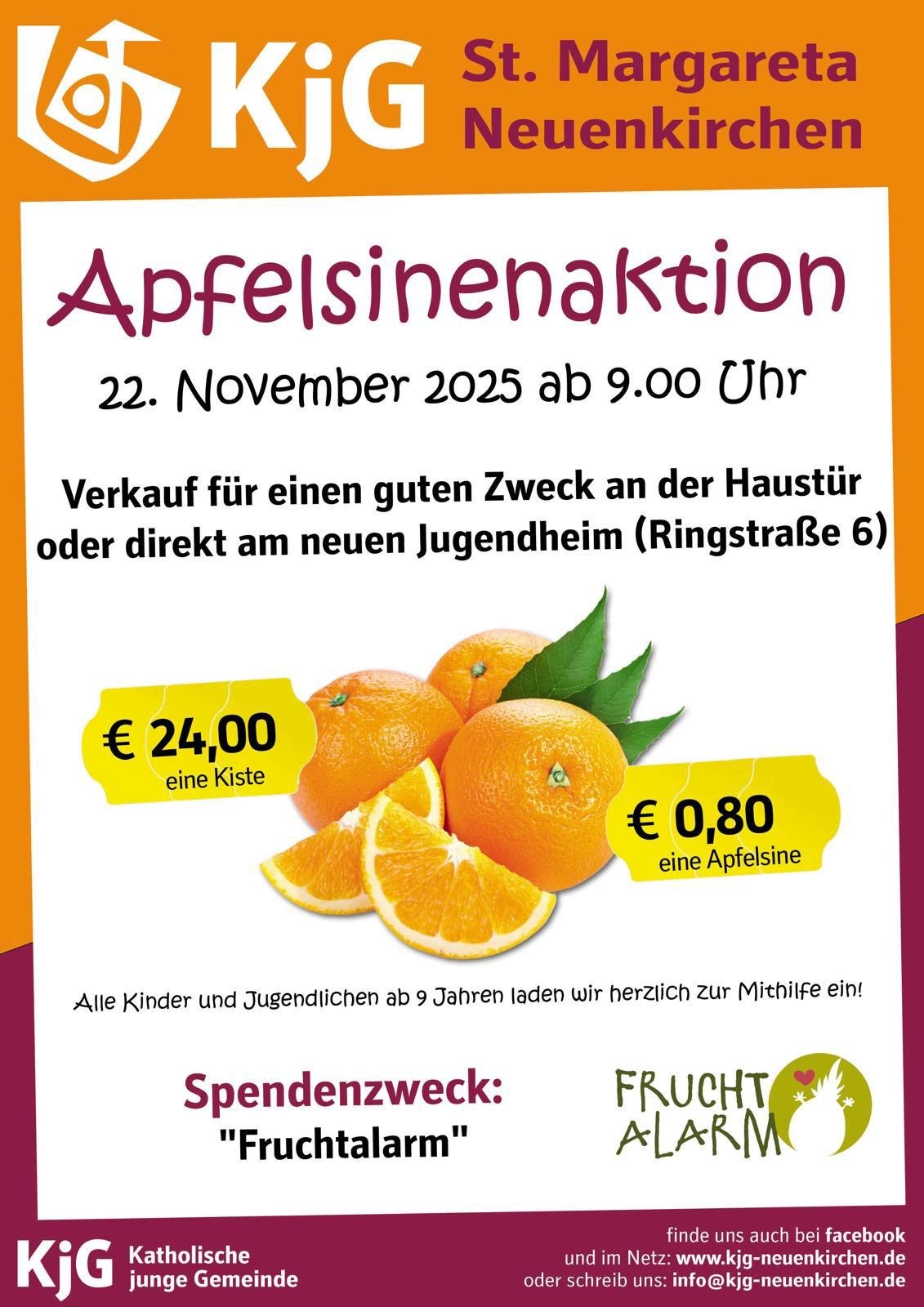 „Apfelsinen für den guten Zweck - Gemeinsam Gutes tun“! Am Samstag ist es endlich wieder soweit: Die KjG startet ihre traditionelle Apfelsinenaktion! Mit Bollerwagen ziehen wir ab 9 Uhr vom Jugend- bzw. Pfarrheim Neuenkirchen von Haus zu Haus und verkaufen die Apfelsinen direkt an der Haustür.