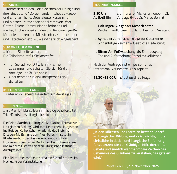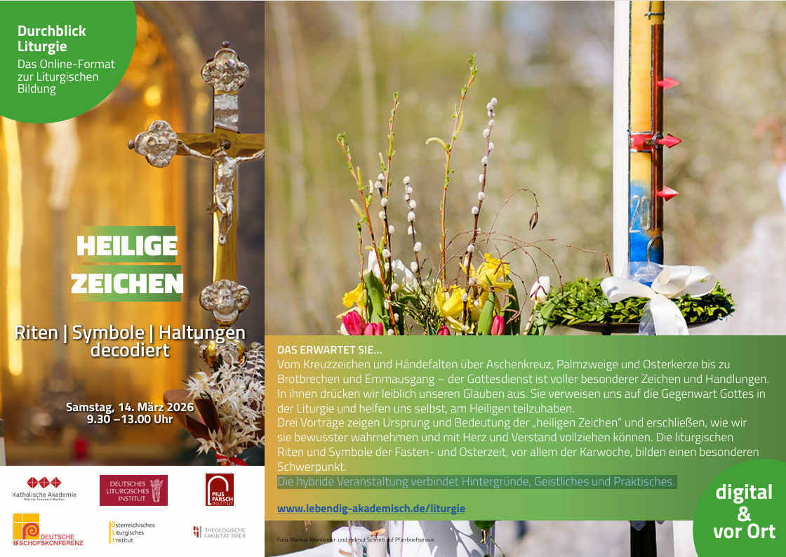 Vom Kreuzzeichen und Händefalten über Aschenkreuz, Palmzweige und Osterkerze bis zum Brotbrechen – der Gottesdienst ist voller besonderer Zeichen und Handlungen. Das Liturgische Institut Trier bietet am 14.03.2026 eine Online-Fortbildung dazu für alle Interessierten an.