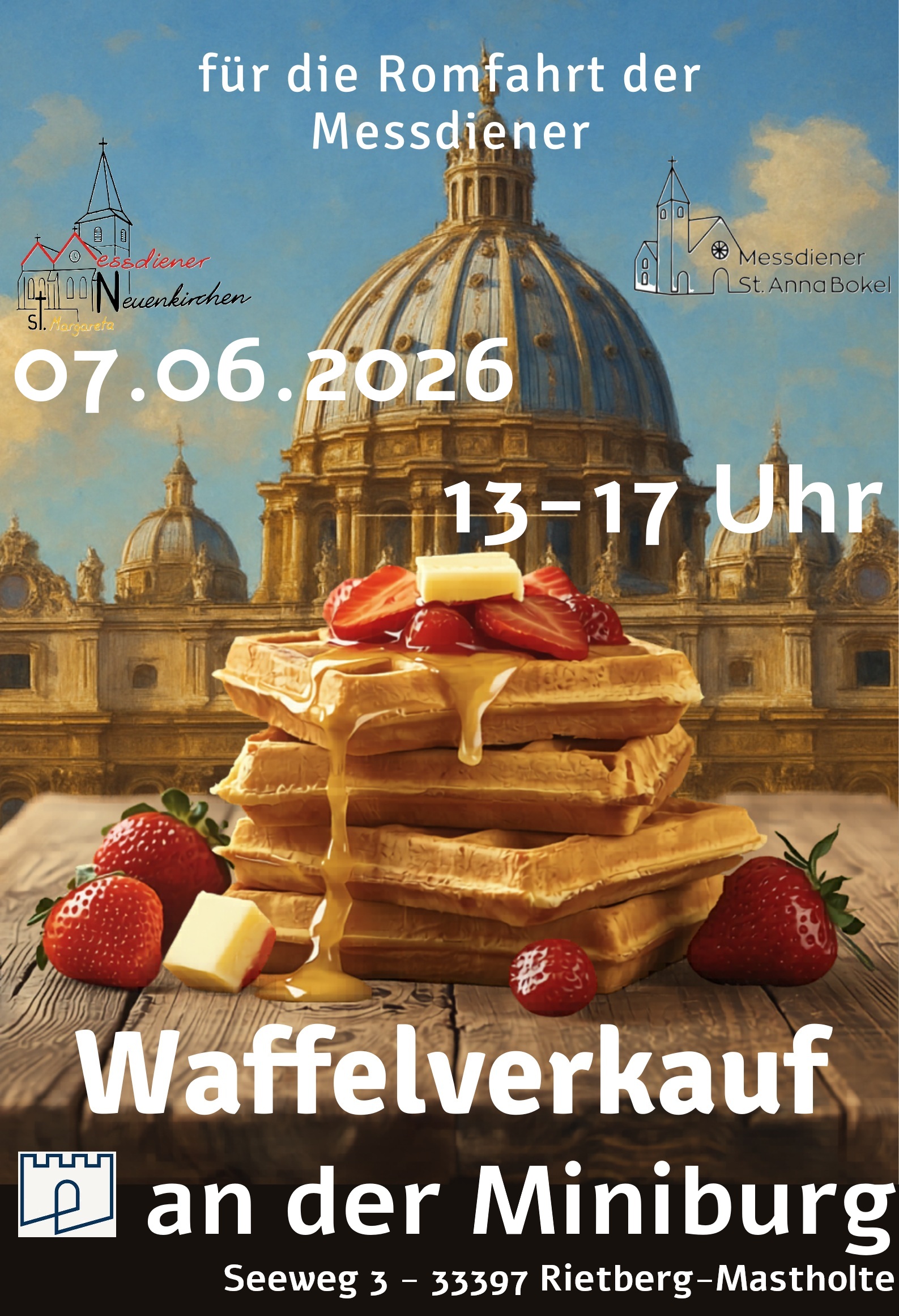 Burgteam bietet Würstchen, Brezel, Waffeln, Kaffee und kalte Getränke an. Für die Kinder sind Spiele bereitgestellt.