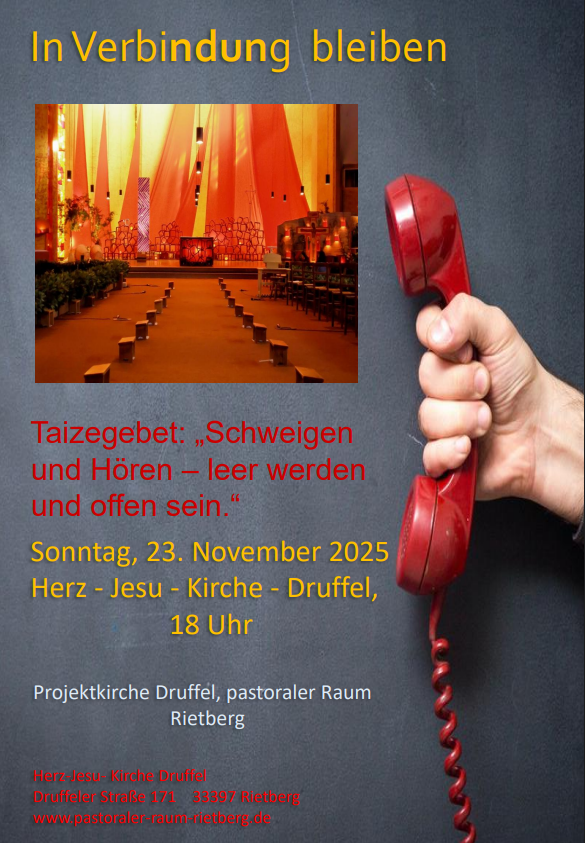 Am Sonntag, den 23. November 2025, findet in der Druffeler Kirche abends um 18 Uhr ein Taizegebet statt. Es steht unter dem Thema „Schweigen und Hören – leer werden und offen sein“.