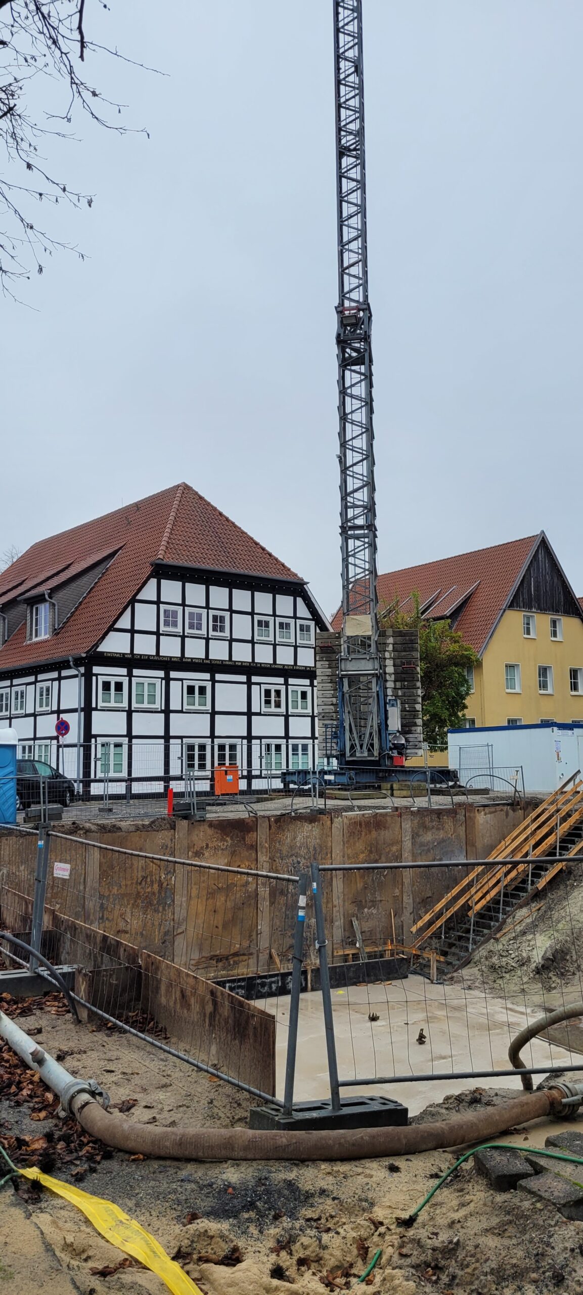 Nachdem die Spundwände zum Schutz der Nachbargrundstücke gesetzt sind, kann es dann an den Abriss des alten Kellers gehen.