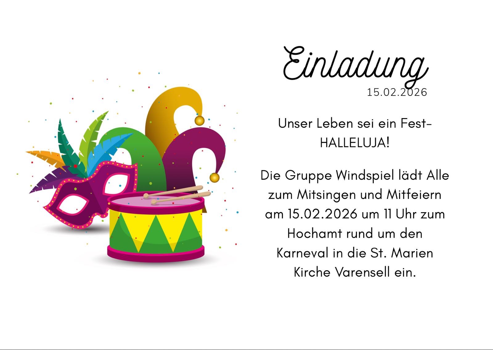 Wir feiern das Hochamt am Karnevalssonntag mit der Freude am Glauben und am Leben. Die Gruppe "Windspiel" wird diese Messe musikalisch gestalten. Kostüme sind herzlich willkommen.