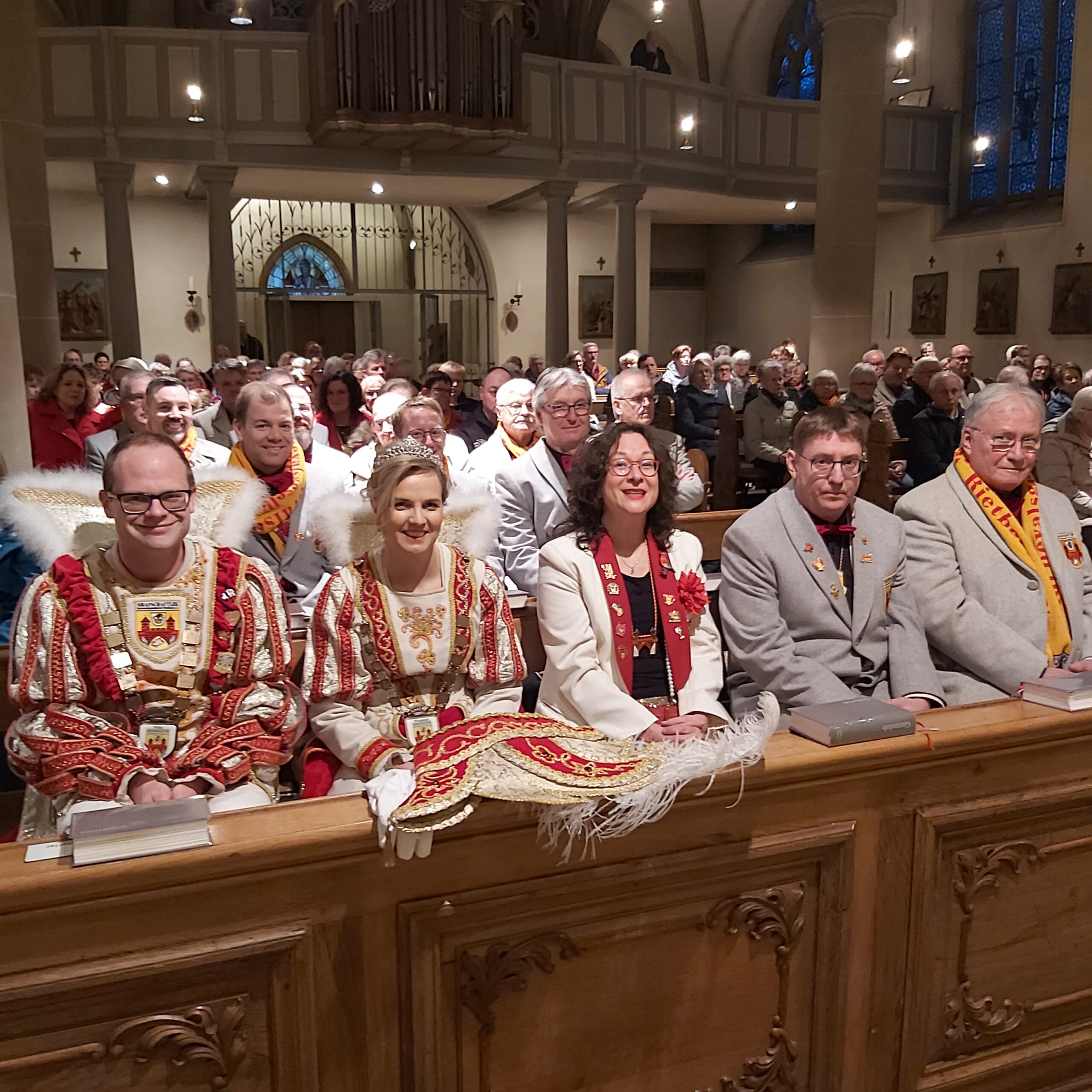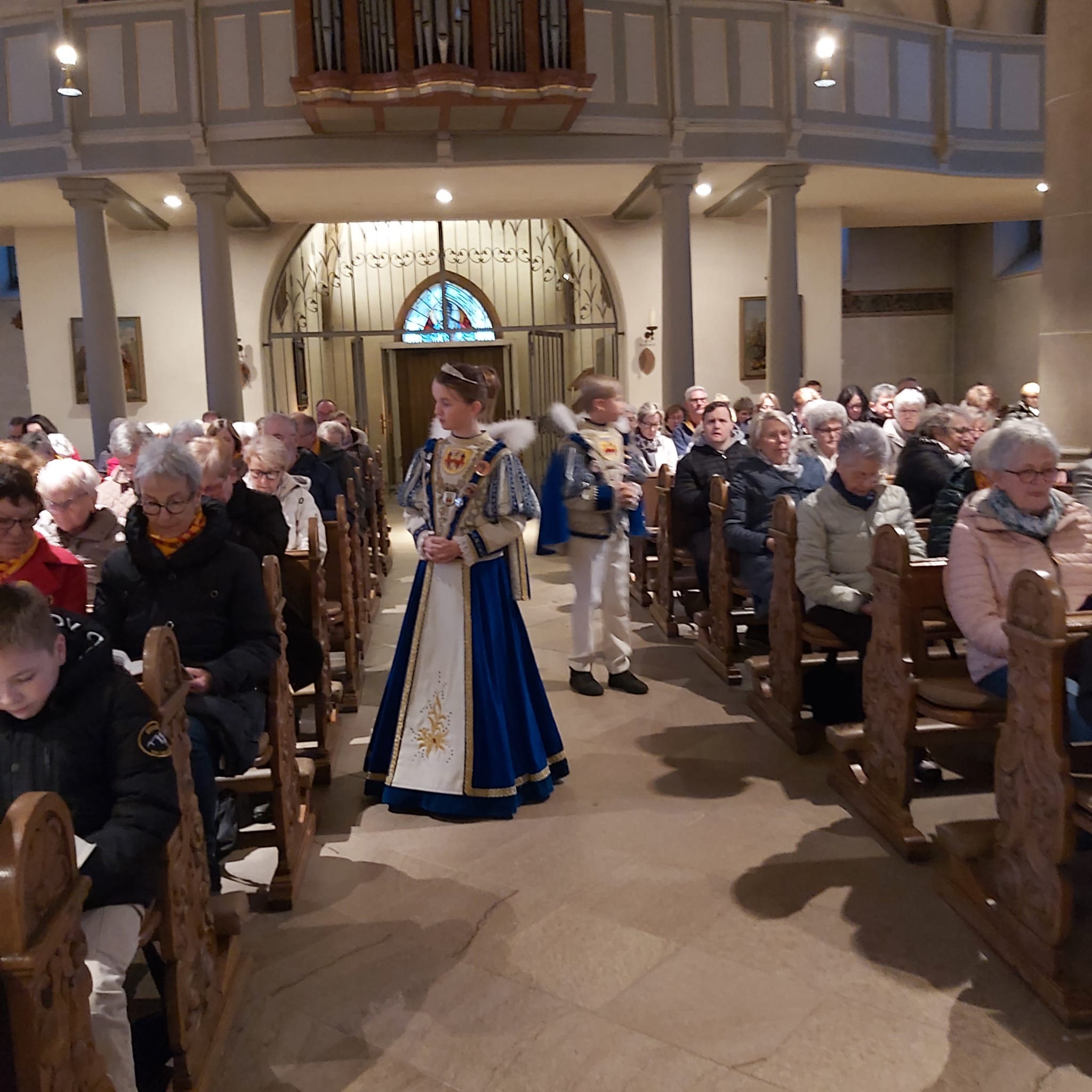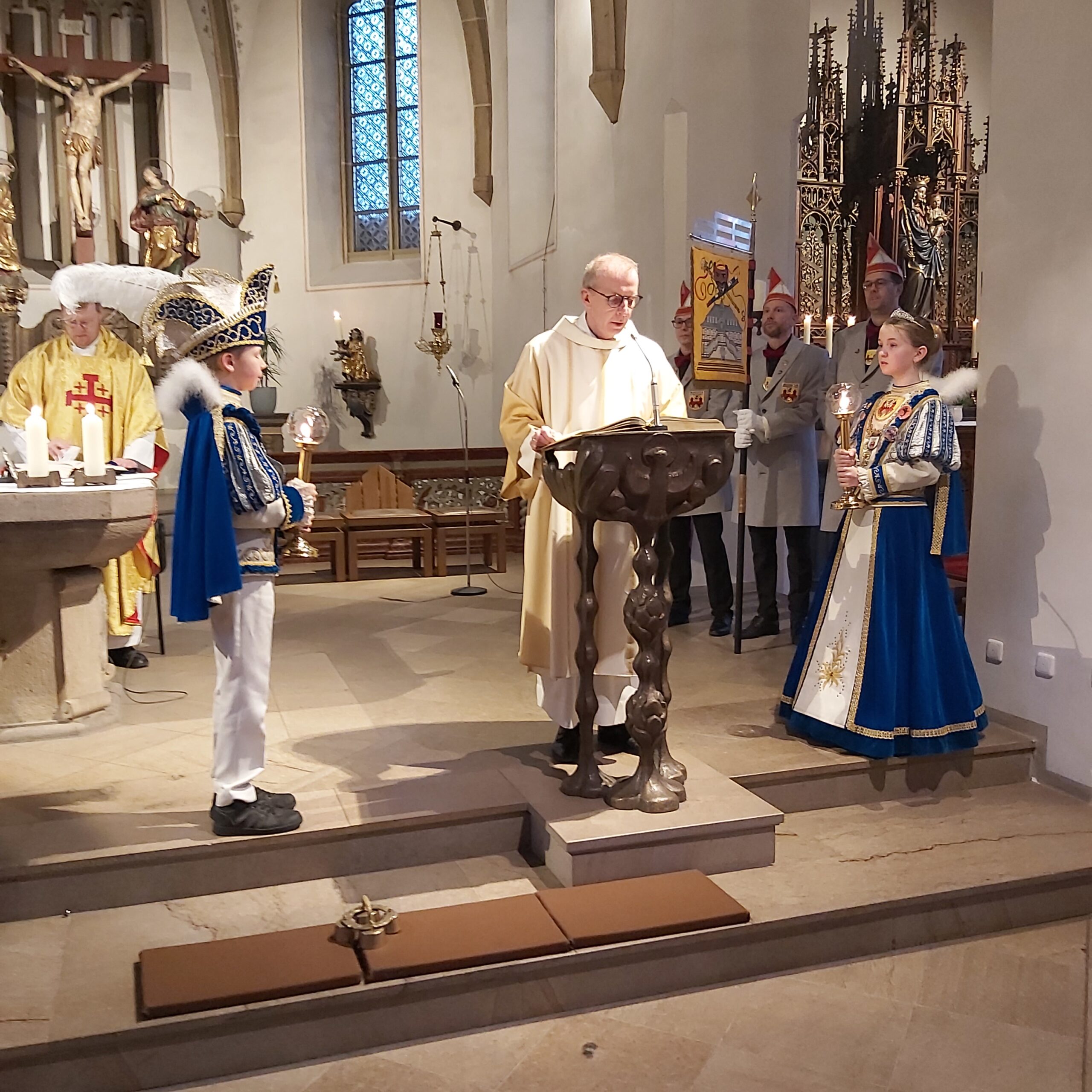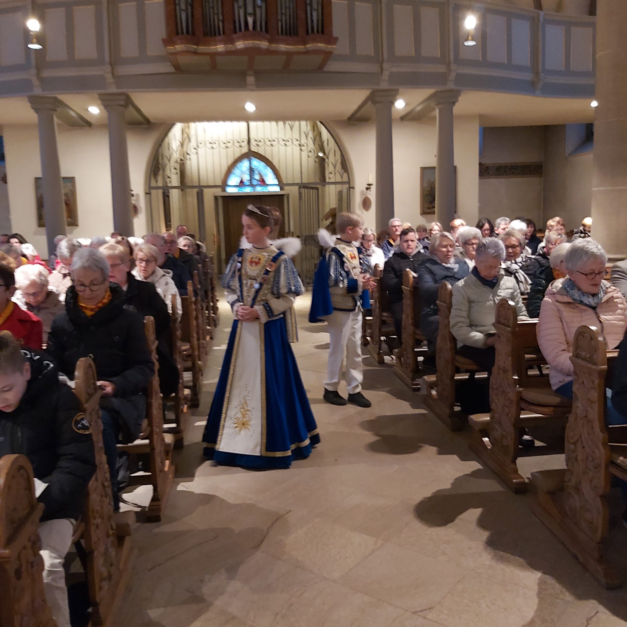 In dieser Messe sind die Tollitäten (also das frisch gekürte Prinzenpaar und das aktuelle Kinderprinzenpaar), der Vorstand, Standarte und Garden dabei.