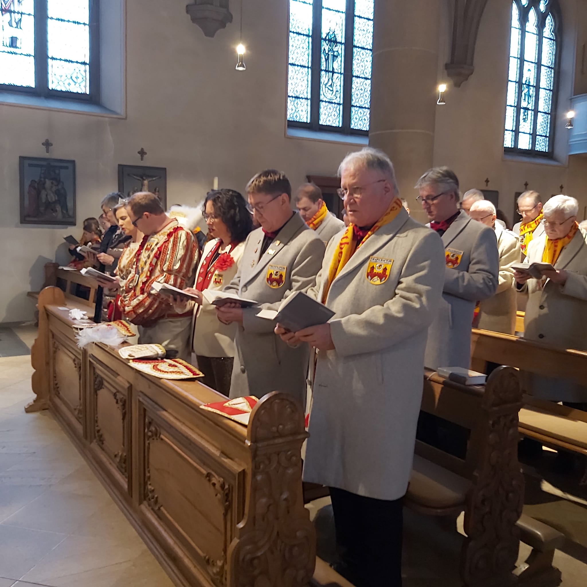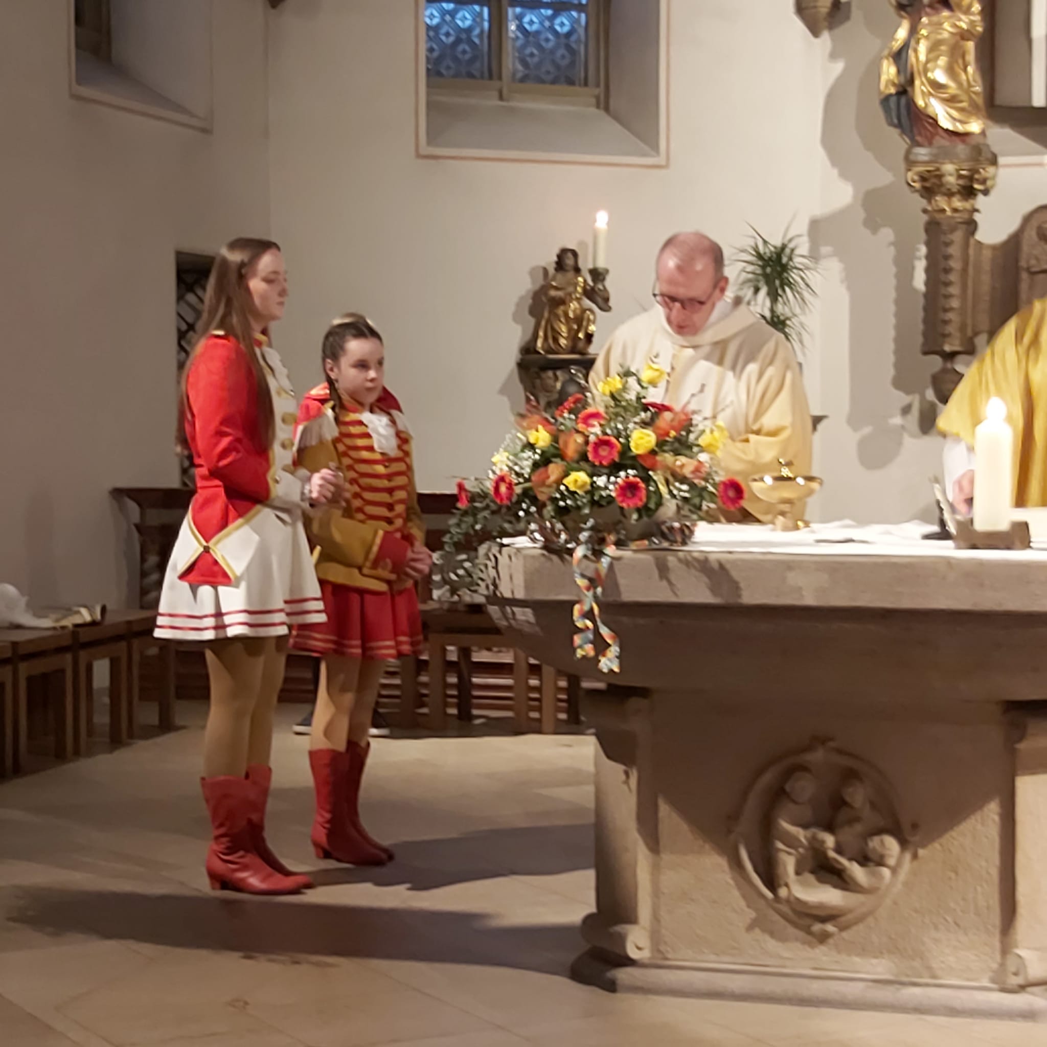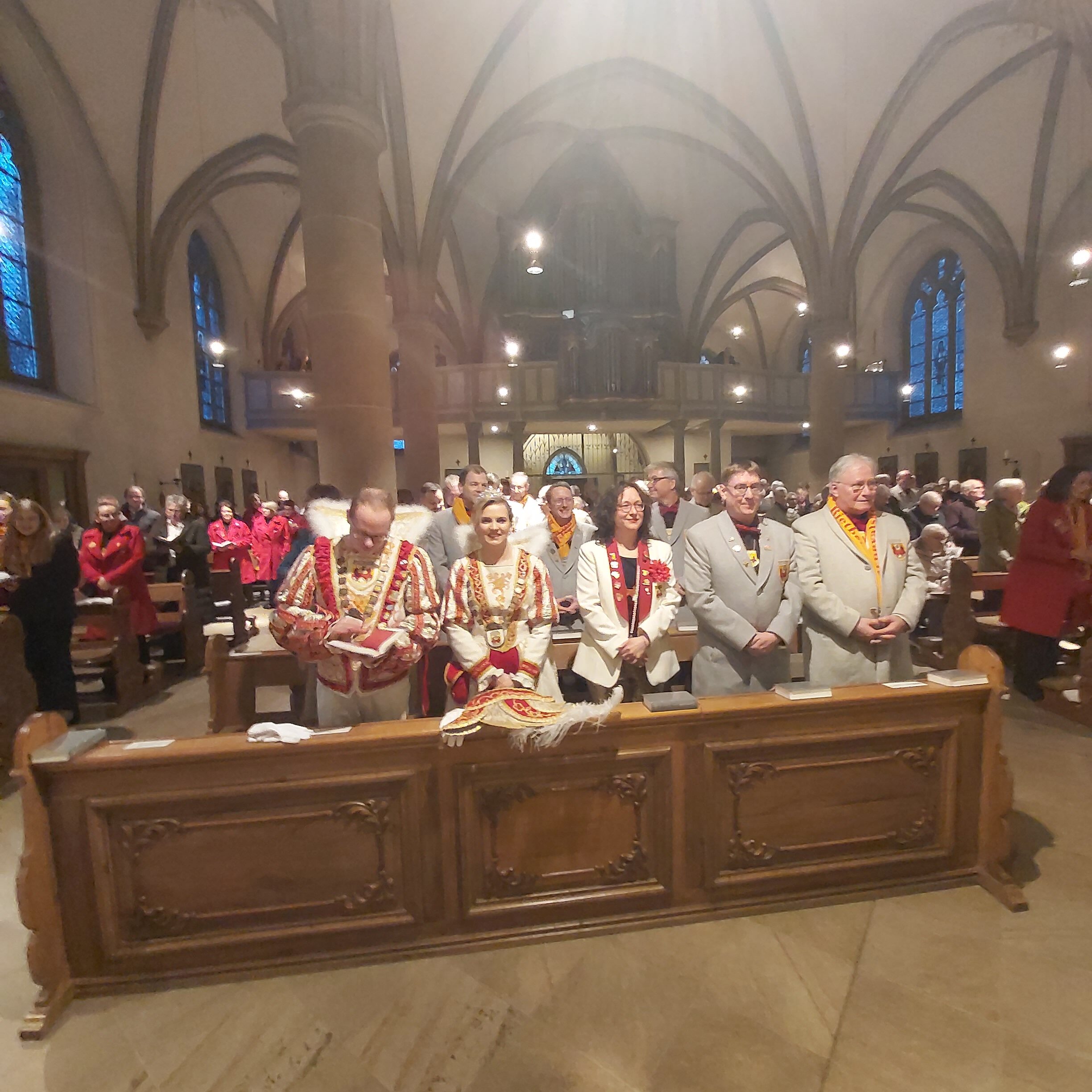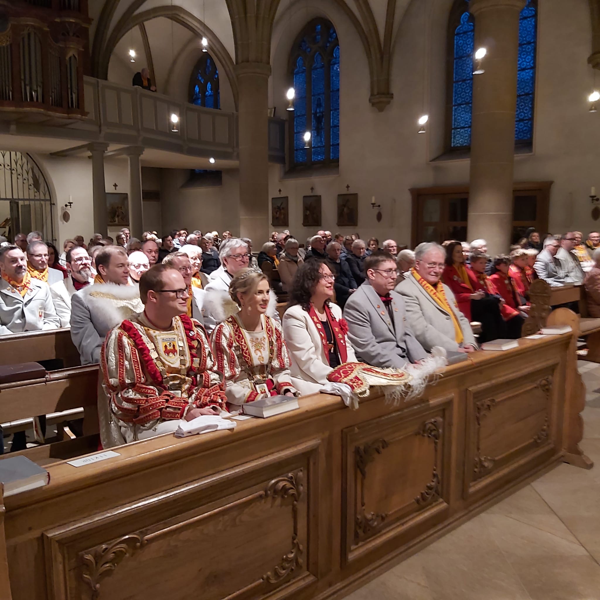 In dieser Messe sind die Tollitäten (also das frisch gekürte Prinzenpaar und das aktuelle Kinderprinzenpaar), der Vorstand, Standarte und Garden dabei.