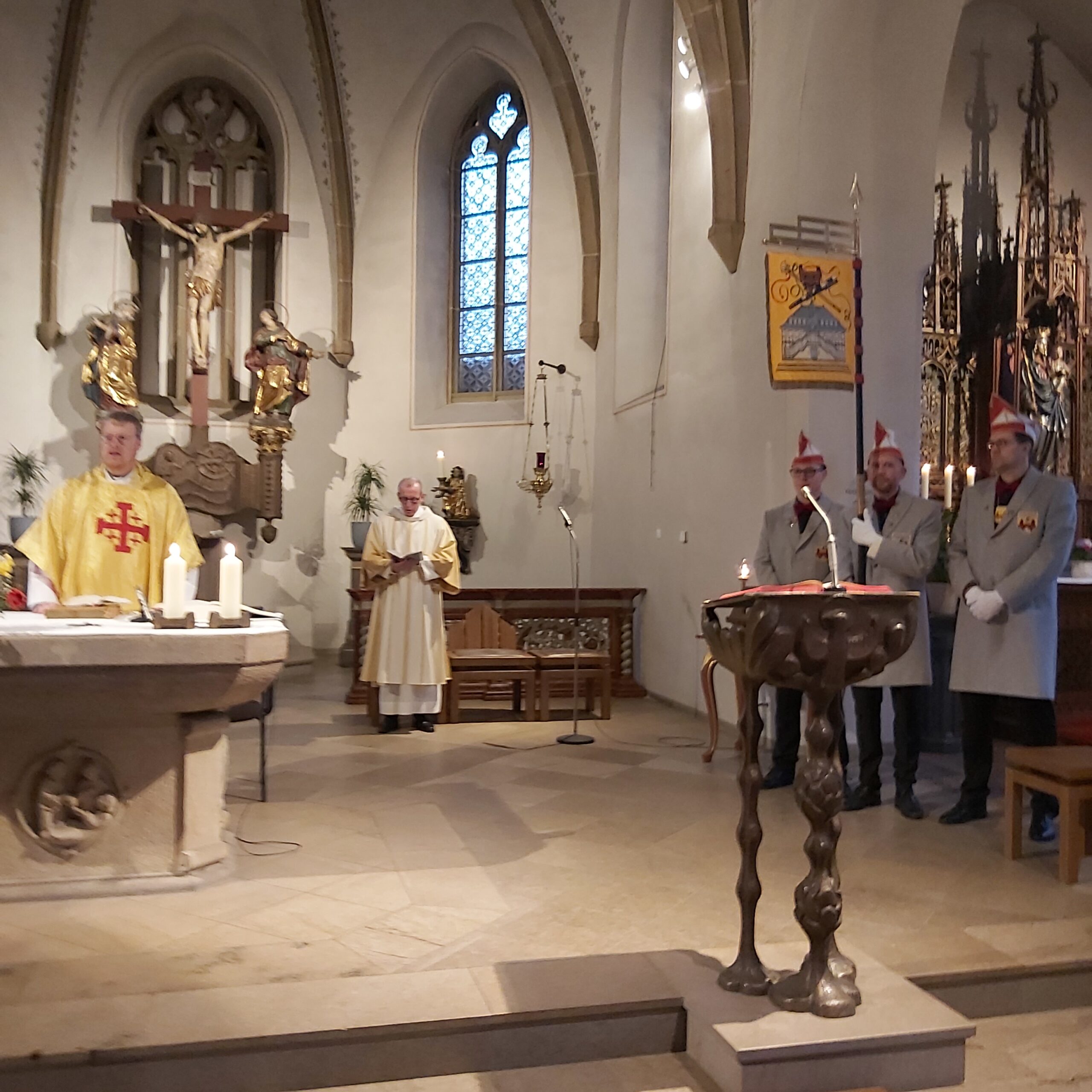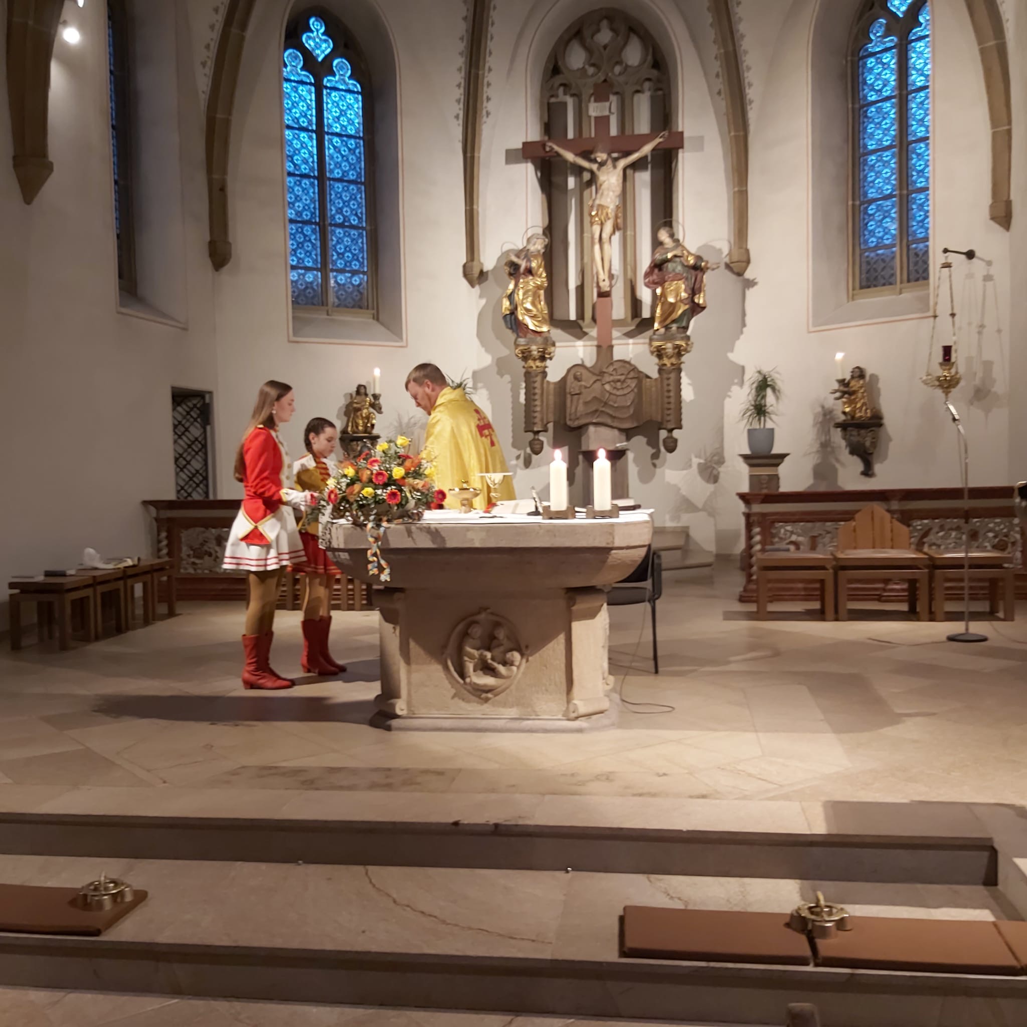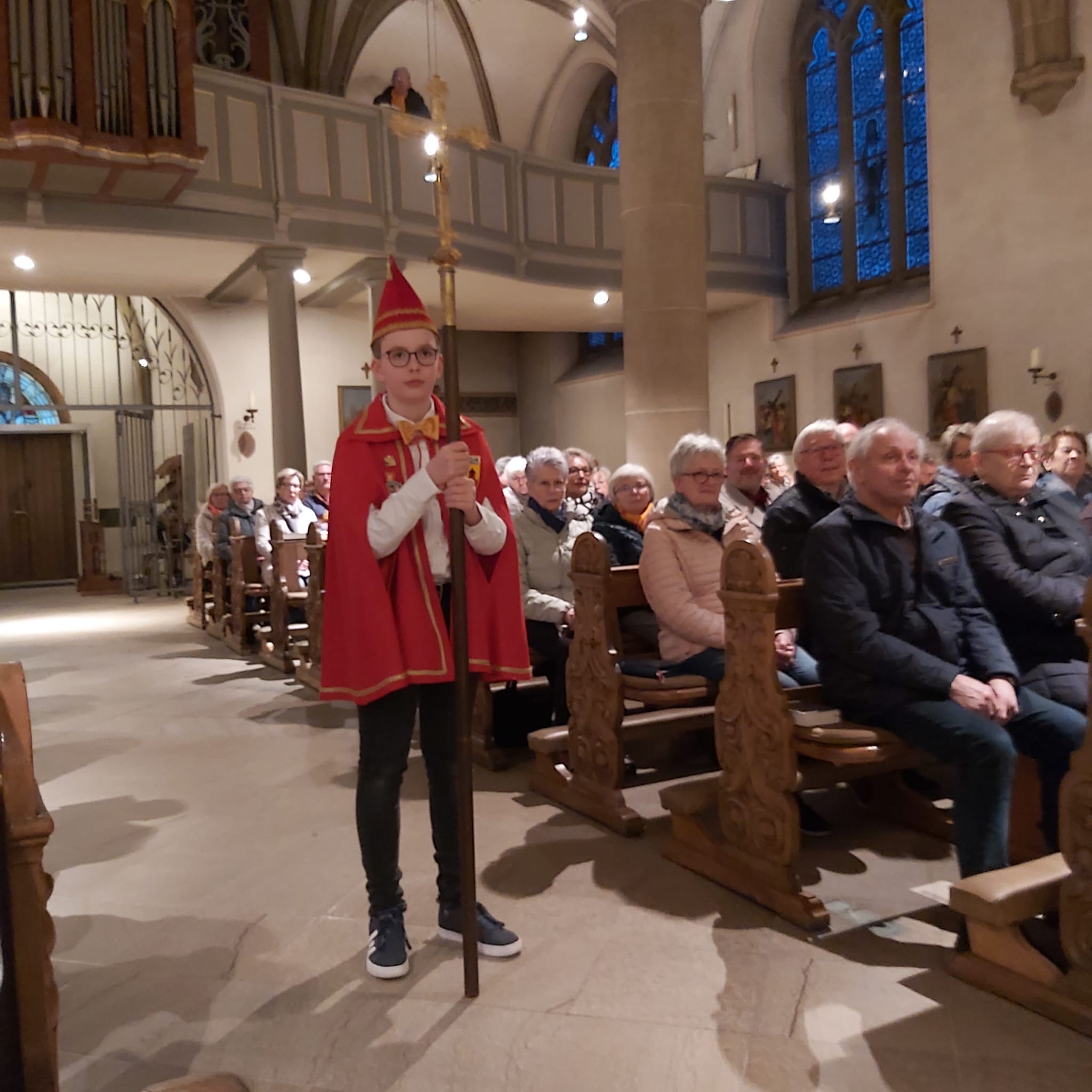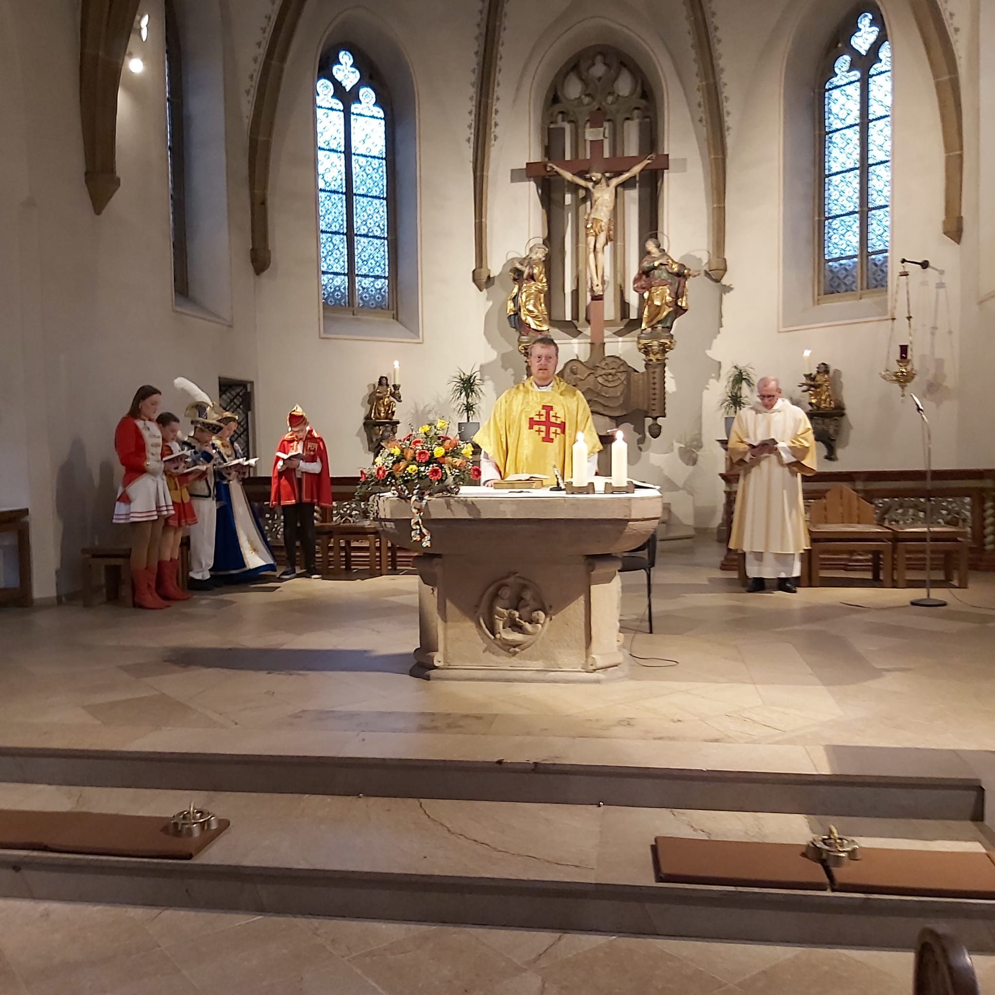 In dieser Messe sind die Tollitäten (also das frisch gekürte Prinzenpaar und das aktuelle Kinderprinzenpaar), der Vorstand, Standarte und Garden dabei.